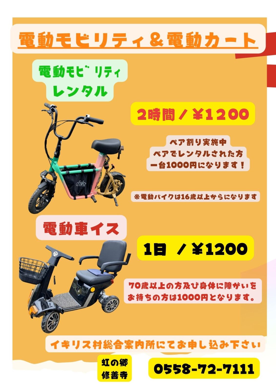 虹の郷、総合案内所では電動モビリティ、電動車イスをレンタルしています。