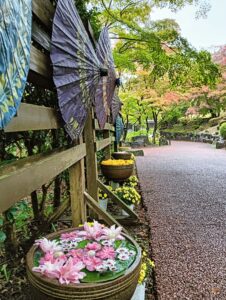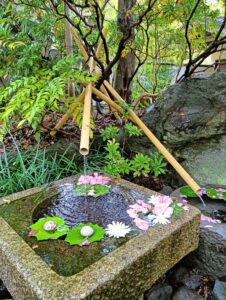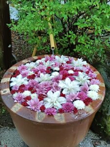 しっとり秋らしい菊の花手水と紅葉しはじめた景色をお楽しみください