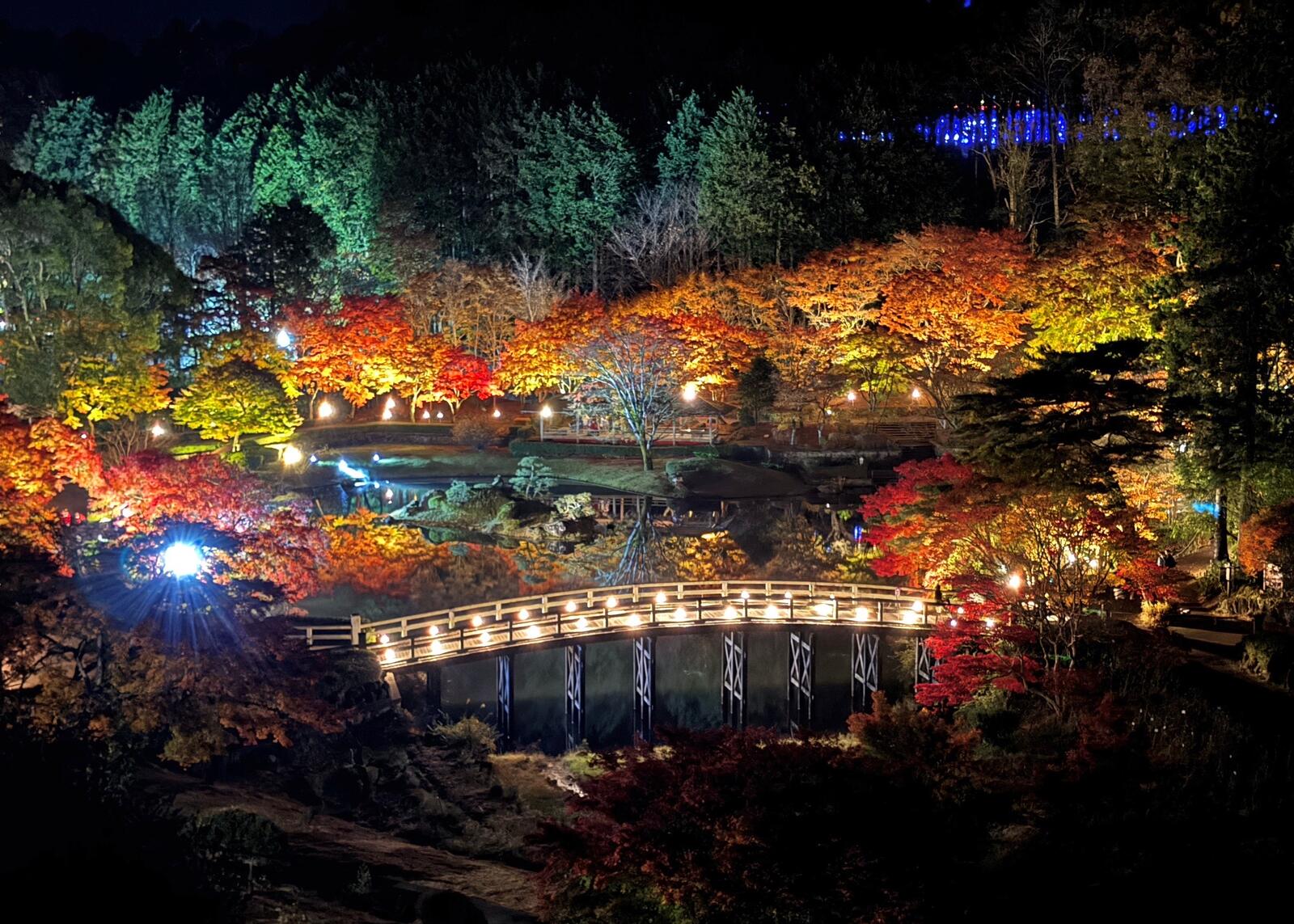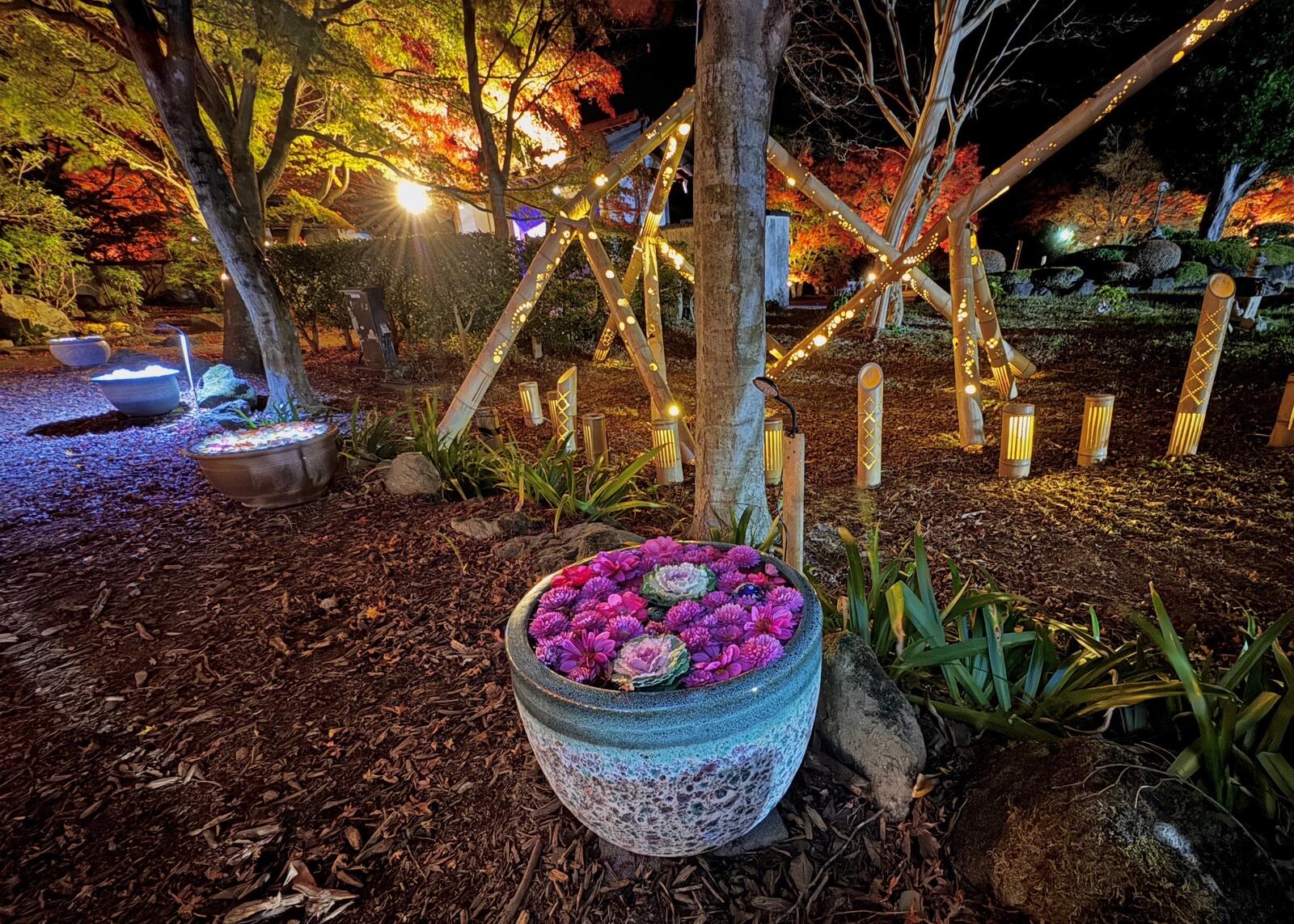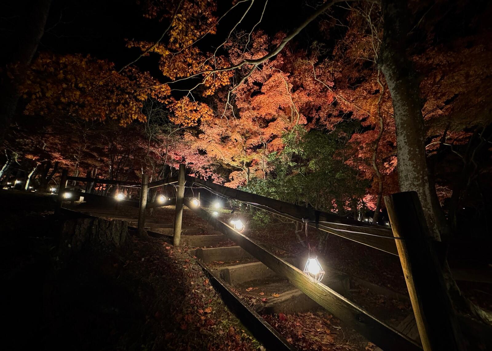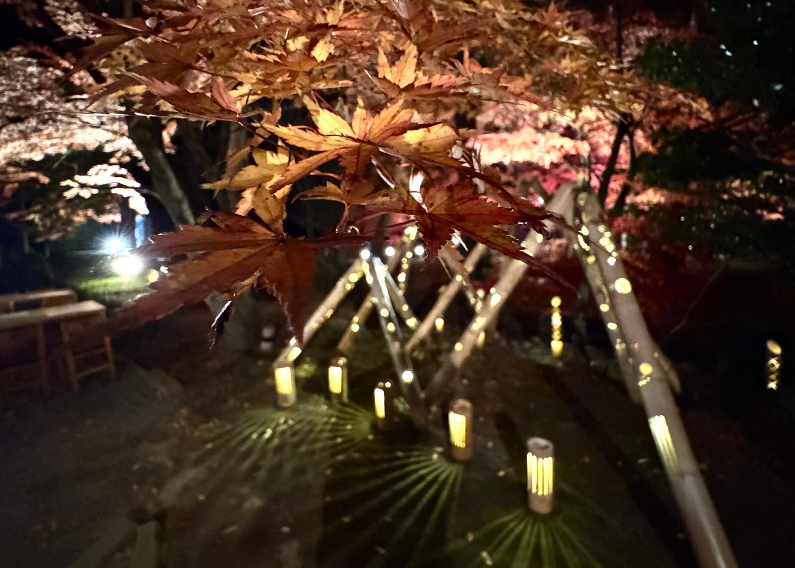 園内を夢のように照らす柔らかな灯りと紅葉の調和