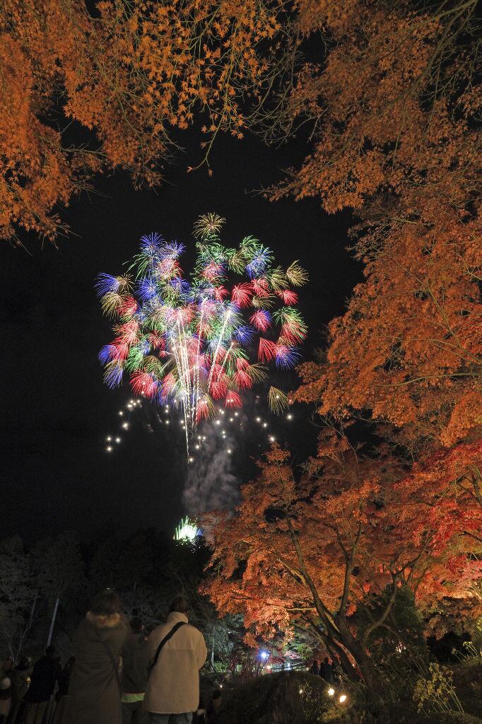 紅葉と光、花火が織りなす一夜の幻想