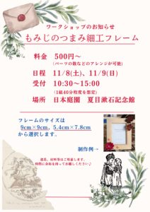 もみじ祭り ワークショップ開催のお知らせ 2025.10.24 「虹の郷 もみじ祭り」開催期間中の 11/8(土)、11/9(日)にワークショップ 「つまみ細工のもみじフォトフレーム作り」を開催いたします。詳細は下記の通りとさせていただきます。 当日の持ち物等は特にございません。お気軽にお越しください。