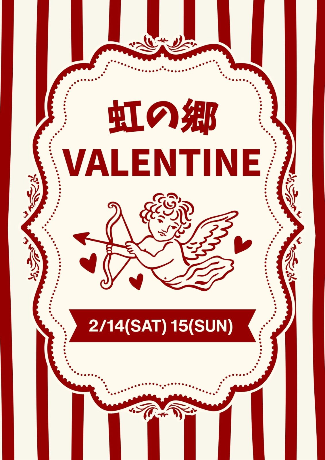 虹の郷バレンタインイベント 2026.2.8 開催期間 2月14日(土)・15日(日) ◾︎ バレンタインマシュマロ焼き ・1串100円 クッキーサンドやチョコソースをかけてお召し上がりください ◾︎バレンタインフォトスポット登場 ピンクを基調にした装飾で写真映え! ・ジオラマ館・ネルソンホール ◾︎園内かくれんぼ人形探し 参加費300円 園内に隠れている人形を探して、見つけたらチョコのお菓子をプレゼント! 家族でもカップルでも楽しめる、バレンタインを虹の郷で!