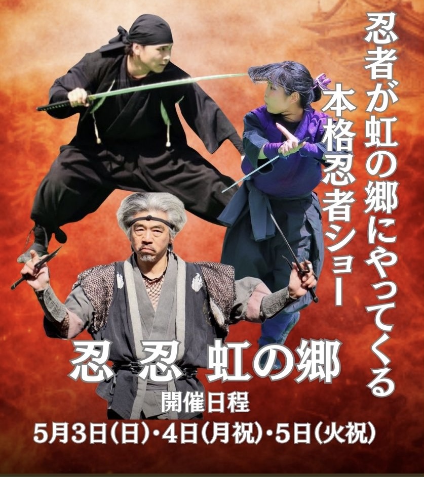 忍 忍 虹の郷をテーマに、忍者ショーや体験イベントを開催します!お子さまから大人まで楽しめるステージです。
